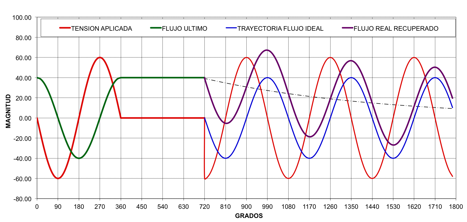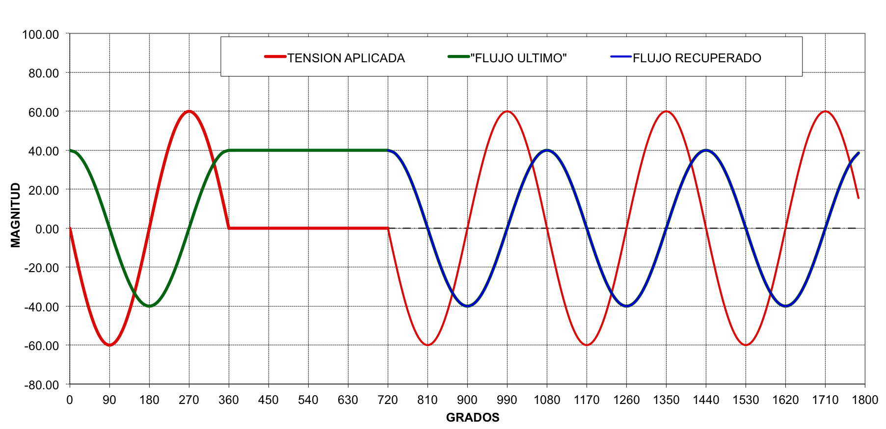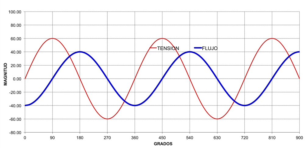 En condiciones normales de operación, la onda de flujo magnético está  atrasada con respecto a la tensión aplicada en 90 grados. FIG No. 10