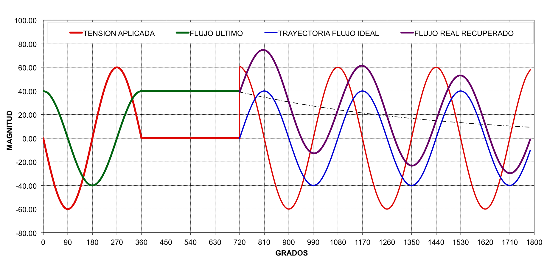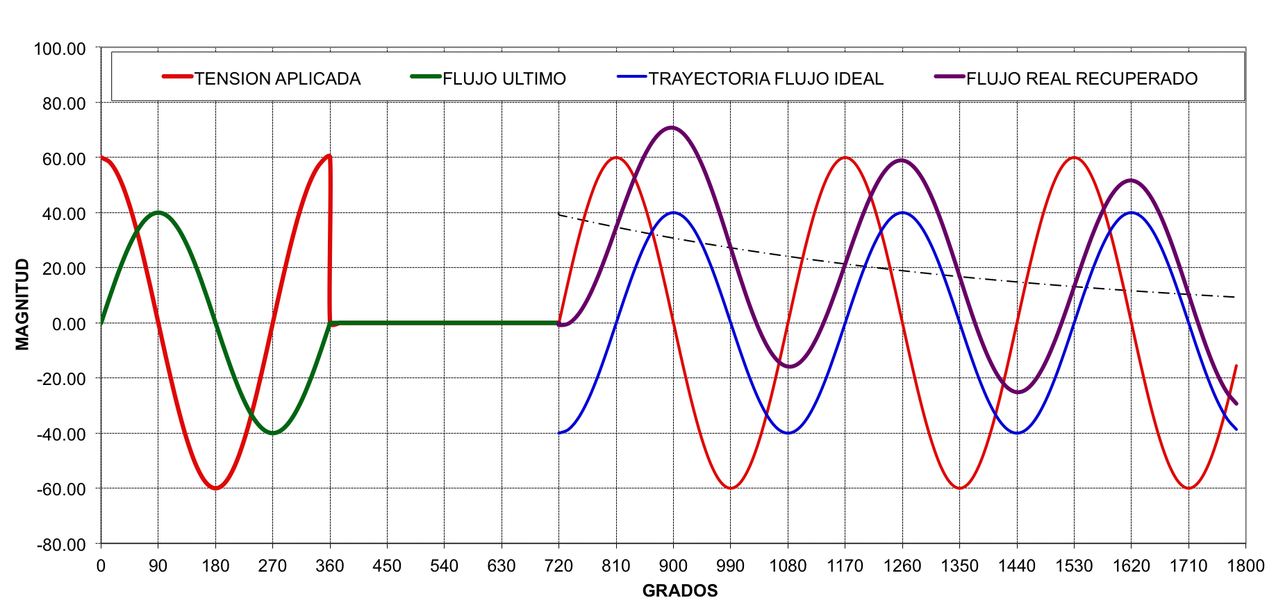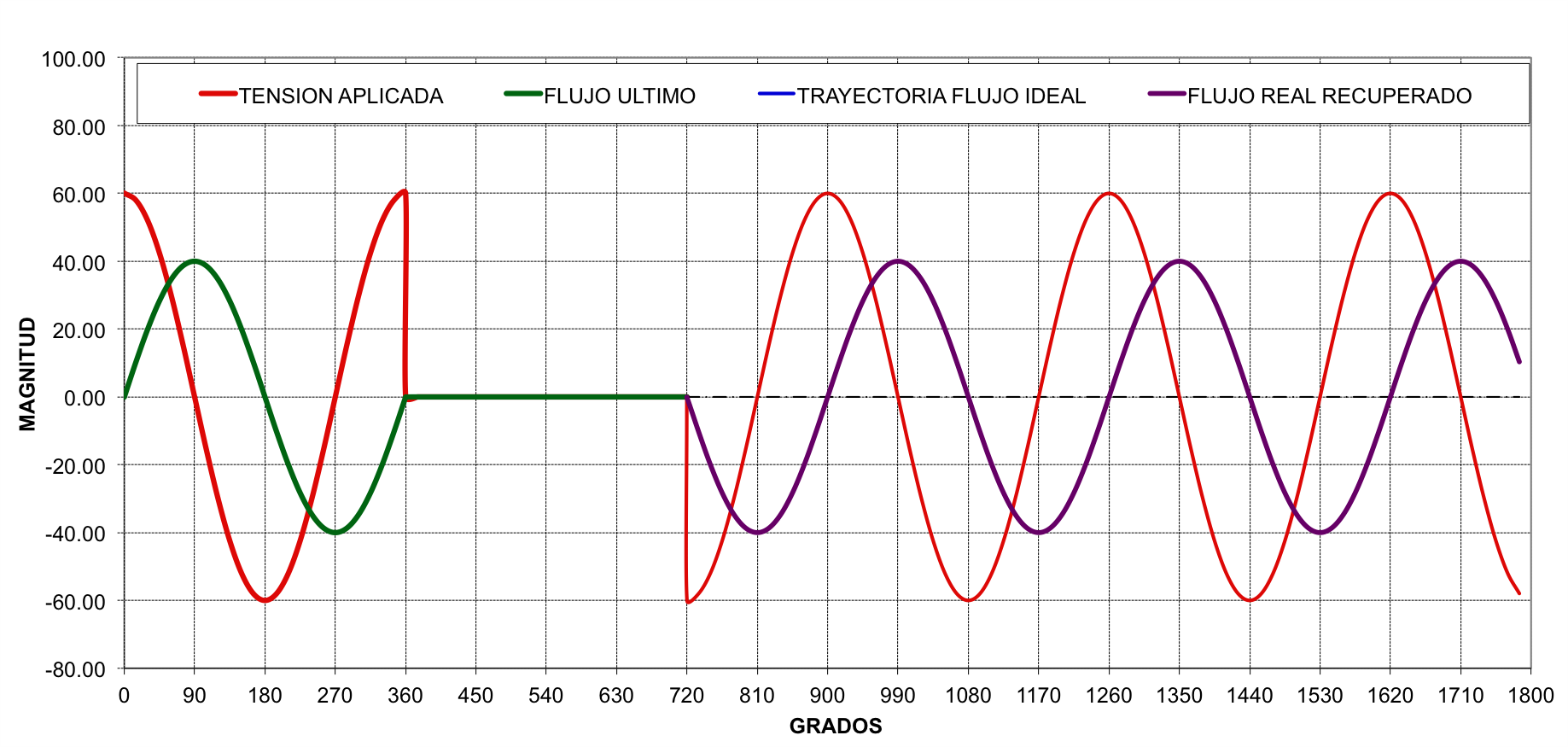 En condiciones normales de operación, la onda de flujo magnético está  atrasada con respecto a la tensión aplicada en 90 grados. FIG No. 10
