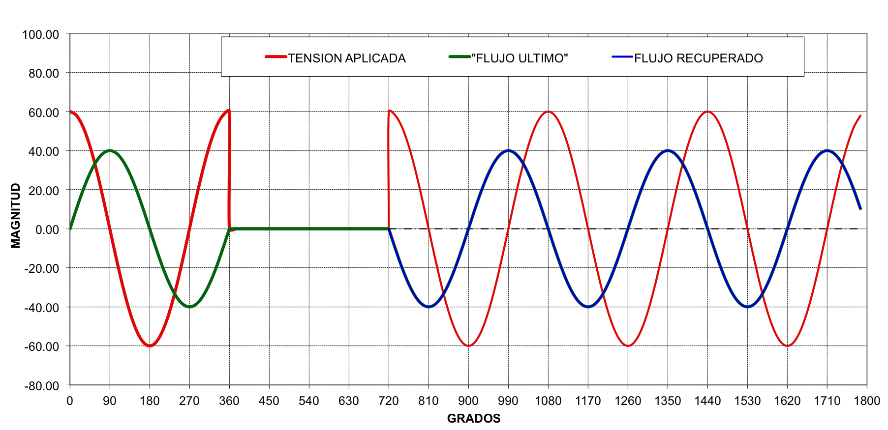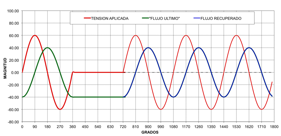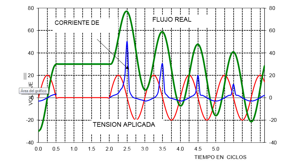 Si la energización se produce bajo las mismas condiciones de Tension que existían al momento de la última desenergizacion, el valor instantáneo del flujo relacionado con la tensión en ese instante será igual con el flujo residual, por lo tanto no habrá una diferencia entre el flujo residual y el valor instantáneo del nuevo flujo impreso por la tensión aplicada.